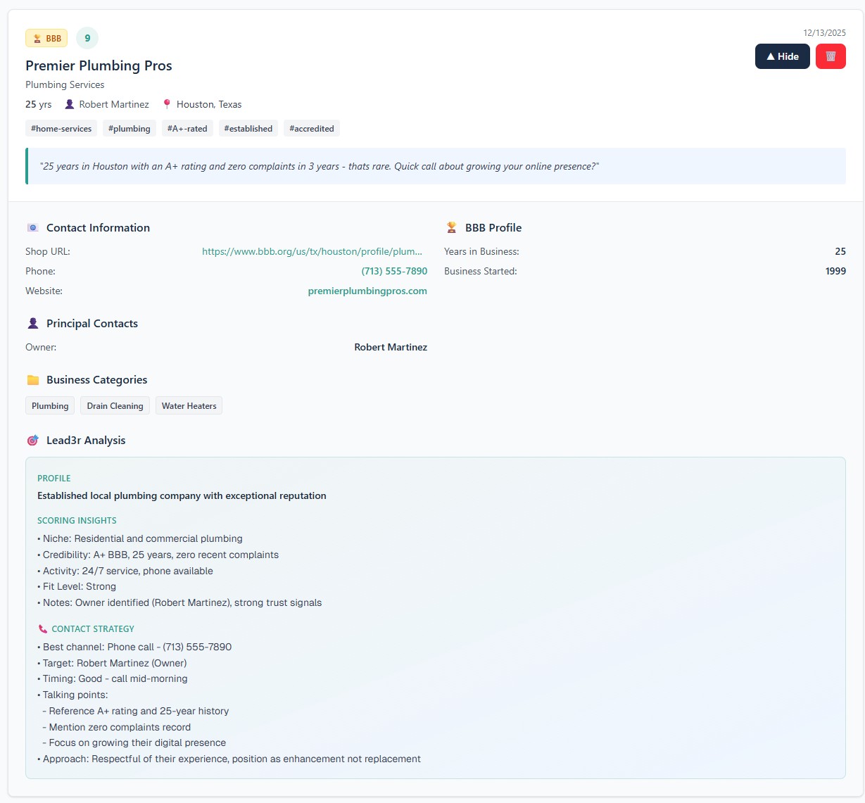 Lead3r organizes BBB profiles the way a human would — if they had unlimited time.