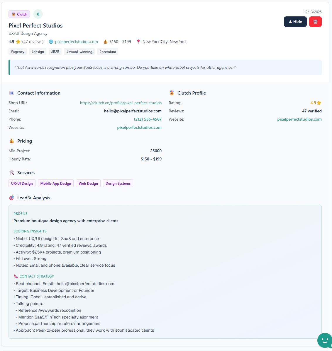 Lead3r extracts structured agency data that is visible on the profile, including agency identity details, services and specialization, pricing indicators, ratings and reviews, credibility signals, and contextual information used for qualification and outreach preparation.