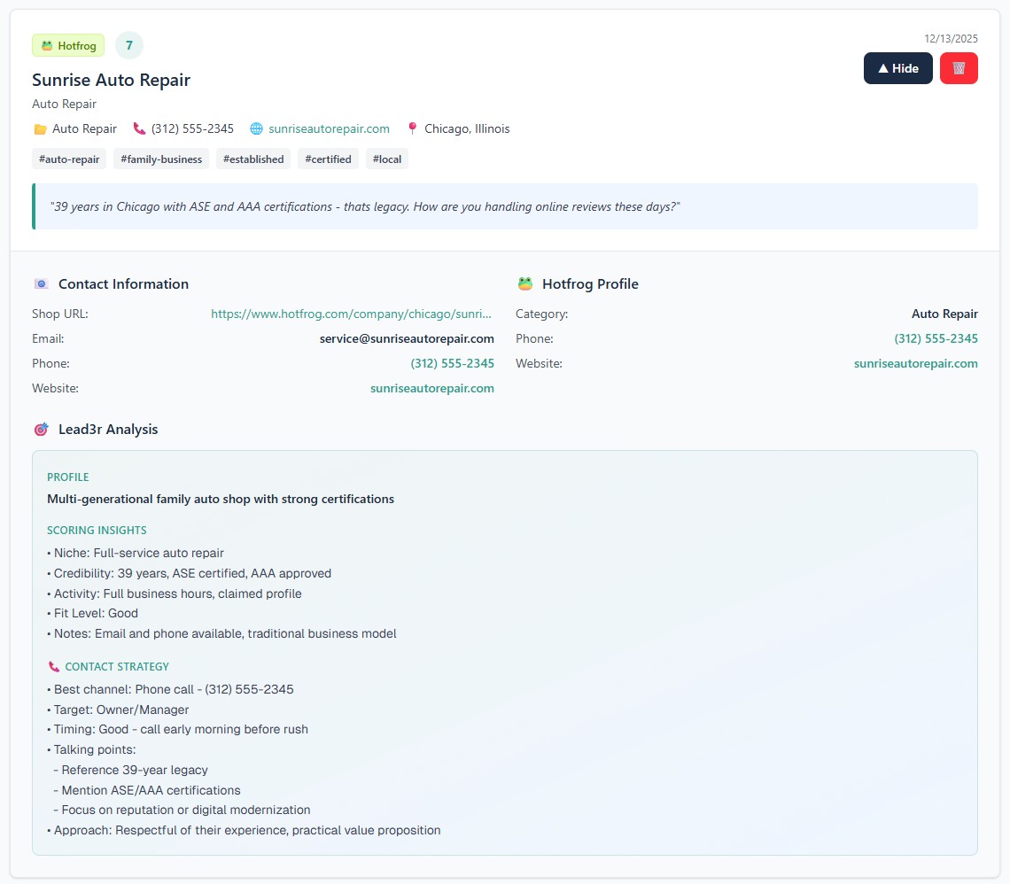 Lead3r generates short summaries and suggested outreach angles based on the business’s services, location, and profile content.