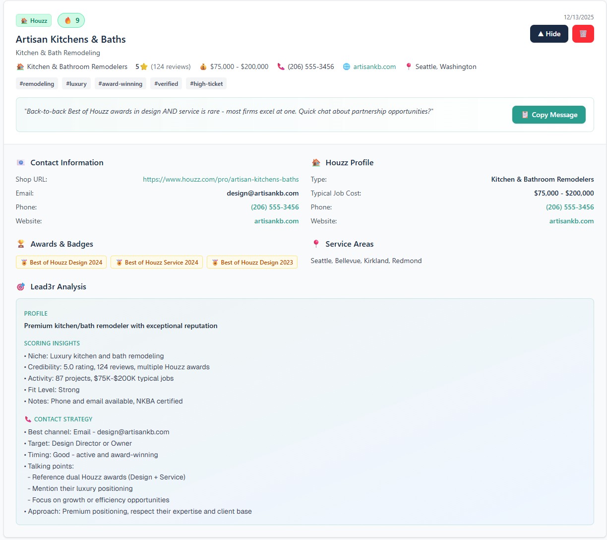 Lead3r extracts structured data that is visible on the Houzz profile, including business name, service categories, descriptions, location, reviews and ratings, portfolio or project indicators, contact details, and other visible credibility signals used for qualification.