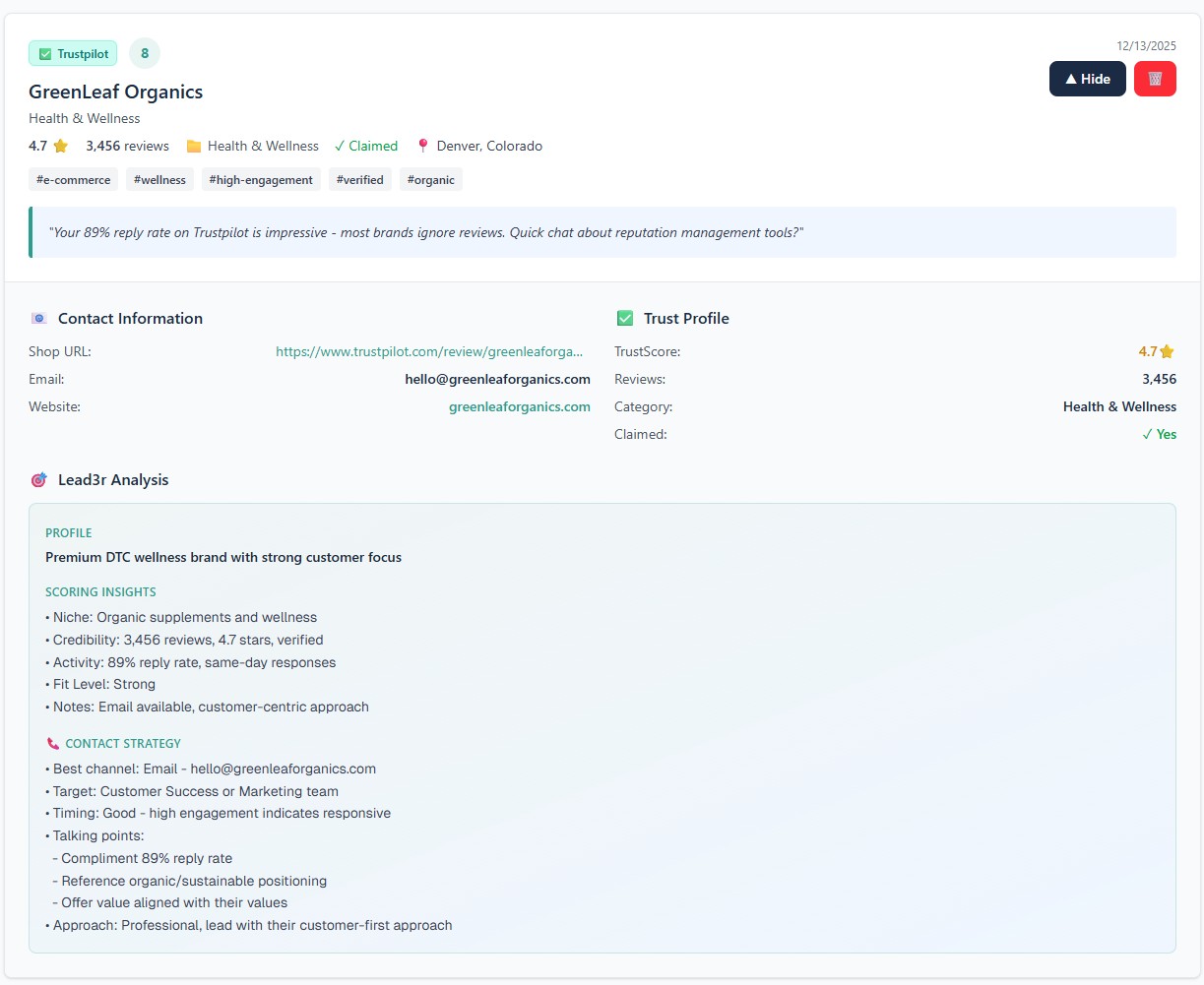 Lead3r extracts structured data that is visible on the Trustpilot profile, including company identity details, category, ratings, review volume, review distribution, reputation indicators, engagement signals, and contextual information used to evaluate credibility and outreach suitability.